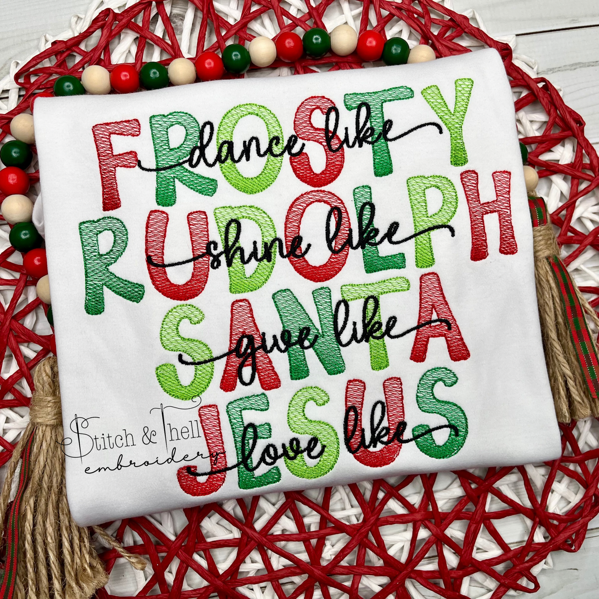 Wrap yourself in the spirit of the season with this cozy sweatshirt that captures everything worth celebrating. Dance with the joy of Frosty, shine with Rudolph's brilliance, give with Santa's generosity, and love with the heart of Jesus. Four timeless reminders woven into one comfortable piece. Embrace all the reasons to rejoice with your choice of shirt or sweatshirt.